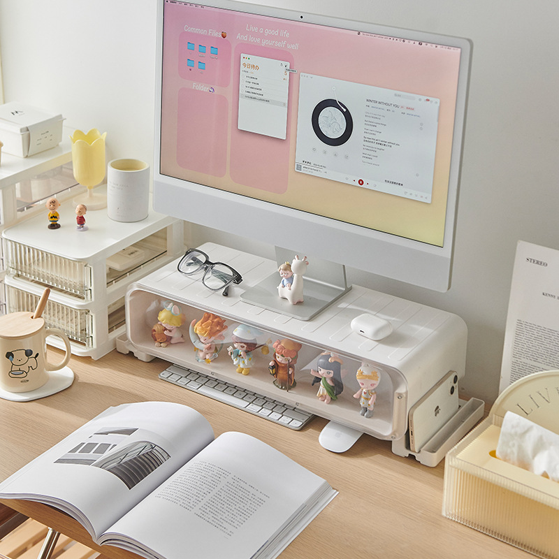 ชั้นวางจอคอม 2in1 52*21.3*15.5cm แบบยกสูง กล่องโชว์โมเดล มีลิ้นชัก มีไฟ สํานักงาน ชั้นวางหน้าจอคอมพิวเตอร์