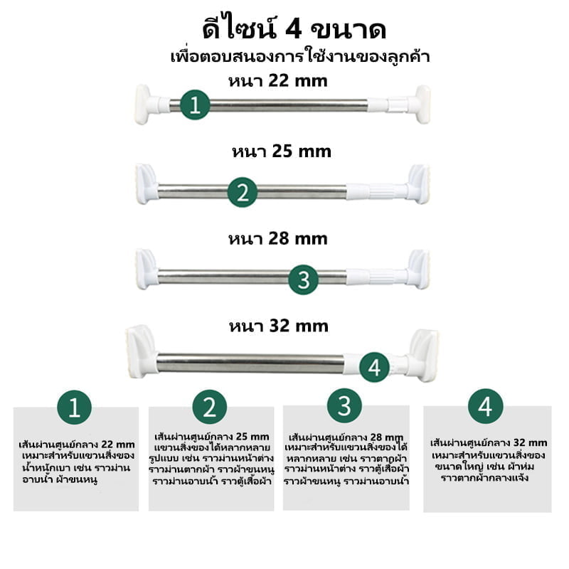 -ทุกขนาดรับน้ำหนักได้สูงสุดที่ 12 กก. (น้ำหนักสูงสุดที่รับได้เป็นน้ำหนักที่ยังไม่ขยายราว ราวยิ่งยืดยาวออกยิ่งรับน้ำหนักได้น้อยลง)